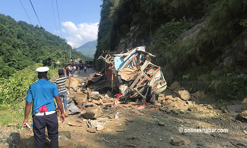 पहिरोले लु १ च ७९९४ नम्बरको कार र ना ३ ख ६१९१ नम्बरको ट्रक पुरेको पुरेको हो । ट्रक र कार ध्वस्त भएका छन् ।